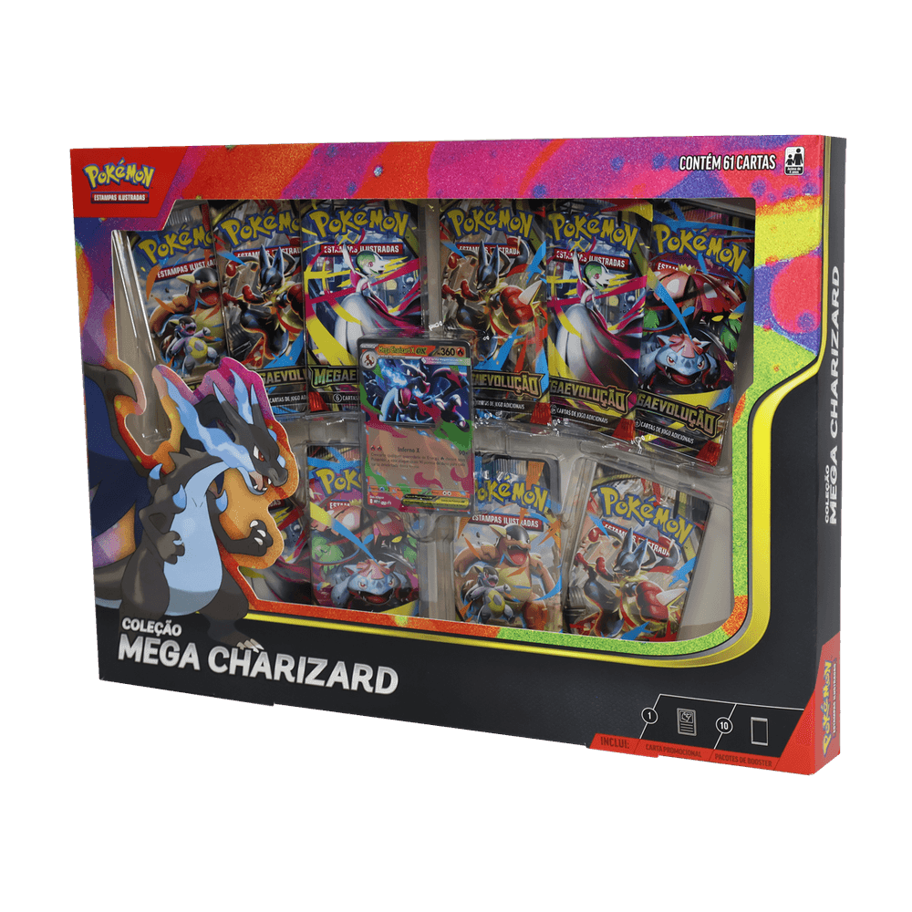 Sob condições certas, incluindo um forte vínculo com seu Treinador, Charizard pode superar seus próprios limites e Megaevoluir! Com essa coleção, você pode escolher entre as chamas azuis e devastadoras de Mega Charizard X ou a agilidade aérea do Mega Charizard Y, e ainda encontrar mais Pokémon nos vários pacotes de Booster.