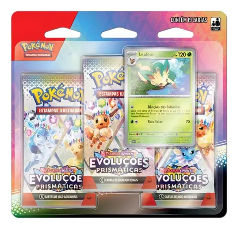 Una suas forças com as Evoluções de Eevee! Fofinhas, mas majestosas, as três Evoluções de Eevee descobertas mais recentemente não devem ser subestimadas em batalha! Junte forças com Leafeon, Glaceon ou Sylveon como uma carta holográfica promocional e abra três pacotes de booster da expansão especial Escarlate e Violeta Evoluções Prismáticas para adicionar ainda mais Pokémon à sua coleção. ITENS INCLUSOS
